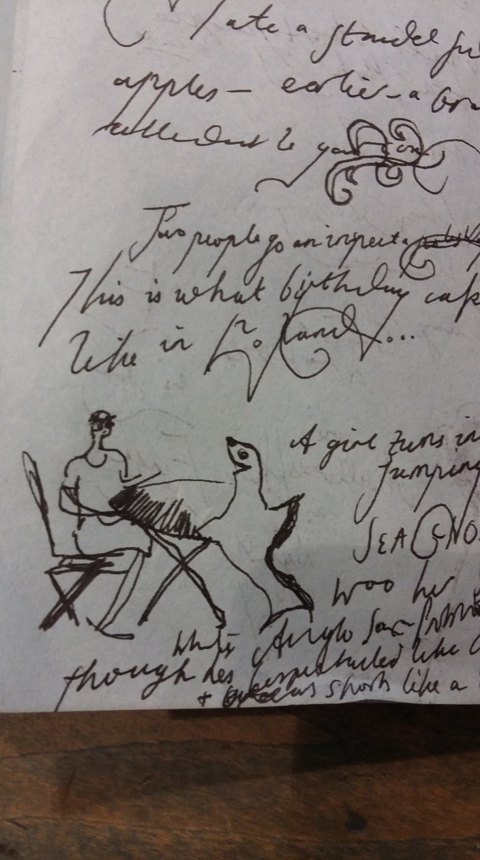 Yesterday, when I had an hour to myself in an Austrian café in Angel, my thoughts were diverted from strudel by the arrival of a hipstery looking bunch. They hovered outside the café a while, warming up the scene all cigarettes, denim, leather, hair gel and orange-red lipstick (gender dependent) . The swagger; the dynamic gesticulations; the brillantine gloss on their brand of hip : what other nationality could they be?* True to form, their conversation turned to the café: the food, the atmosphere and most of all the clientele. Who were they? What were they doing? Were they worth anyone’s attention? They noticed the trendy couple on the blind date, the homelier ladies who tea, me as I sat doodling in my battered blue notebook. The girl said she’d like one like that, to write down her thoughts. The guy wondered what I was writing about so furiously. I blushed again, signalling that I had understood, but this time sat up straight, produced elaborate flourishes on my gs and ys, draw intricate marine-life inside a greetings card.If I was being so openly watched, I would be part of the spectacle, play up to the role of ponytailed Sunday scribbler. I think how these people know, to misquote Audrey Hepburn’s Sabrina, how to ‘be in the café , and of the café’; to treat it as a glamorous watch point, and not a convenience or escape.