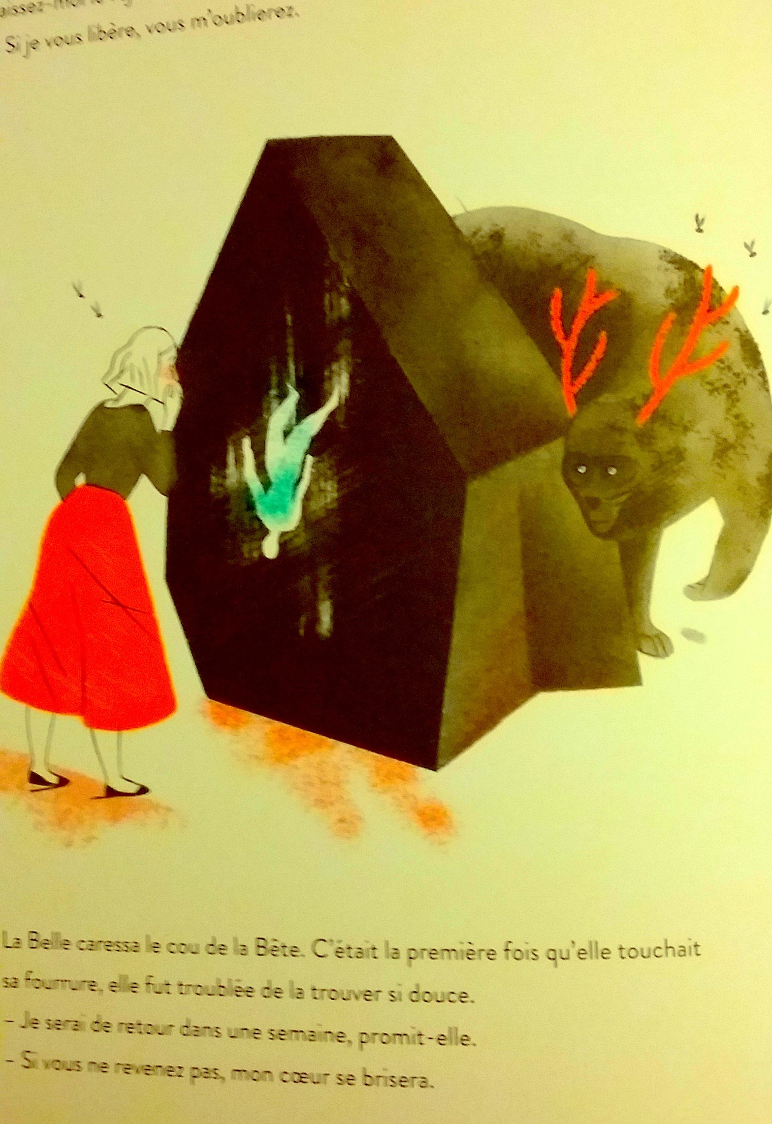 Translation: ‘It was the first time she touched his fur and was troubled at finding it so soft…’ Is this really a children’s book? Illustration by Violaine Leroy